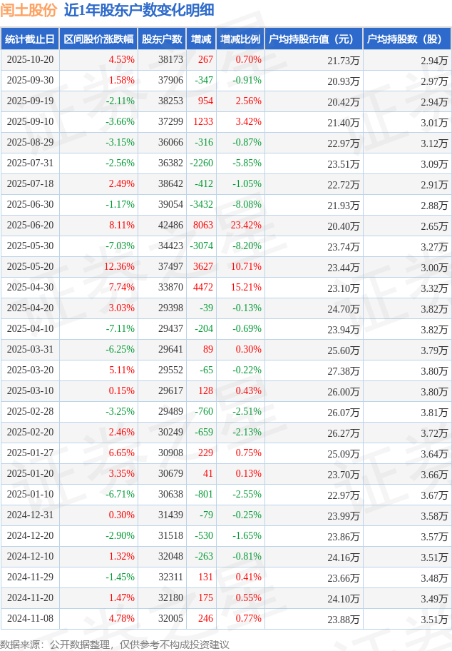 从股价来看,2025年9月30日至2025年10月20日,闰土股份区间涨幅为4.53%,在此期间股东户数增加267.0户,增幅为0.7%。