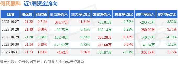 资金流向数据方面,本周何氏眼科主力资金合计净流出50.02万元,游资资金合计净流出0.34万元,散户资金合计净流入50.36万元。本周资金流向一览见下表: