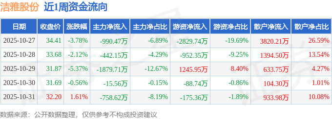 资金流向数据方面,本周洁雅股份主力资金合计净流出4086.52万元,游资资金合计净流出2800.23万元,散户资金合计净流入6886.75万元。本周资金流向一览见下表: