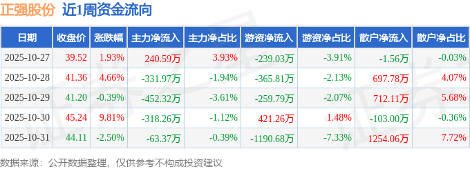 资金流向数据方面,本周正强股份主力资金合计净流出925.33万元,游资资金合计净流出1634.05万元,散户资金合计净流入2559.39万元。本周资金流向一览见下表: