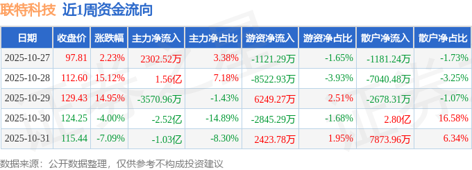 资金流向数据方面,本周联特科技主力资金合计净流出2.12亿元,游资资金合计净流出3816.46万元,散户资金合计净流入2.5亿元。本周资金流向一览见下表: