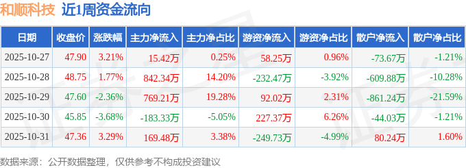 资金流向数据方面,本周和顺科技主力资金合计净流入1613.13万元,游资资金合计净流出104.56万元,散户资金合计净流出1508.57万元。本周资金流向一览见下表: