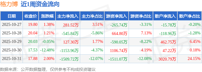 资金流向数据方面,本周格力博主力资金合计净流出2800.69万元,游资资金合计净流出595.32万元,散户资金合计净流入3396.01万元。本周资金流向一览见下表: