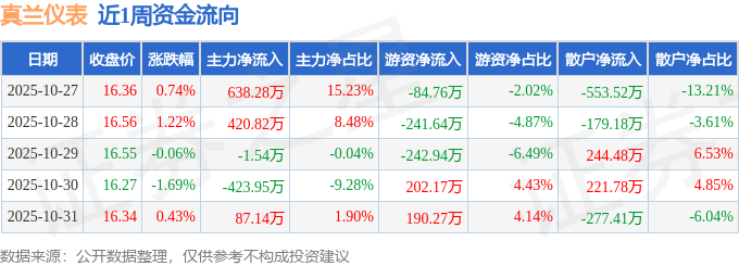 资金流向数据方面,本周真兰仪表主力资金合计净流入720.76万元,游资资金合计净流出176.91万元,散户资金合计净流出543.85万元。本周资金流向一览见下表: