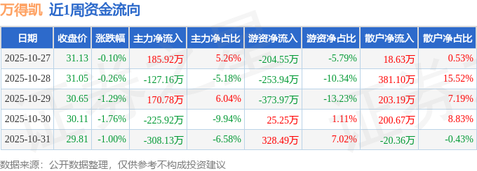 资金流向数据方面,本周万得凯主力资金合计净流出304.51万元,游资资金合计净流出478.72万元,散户资金合计净流入783.23万元。本周资金流向一览见下表: