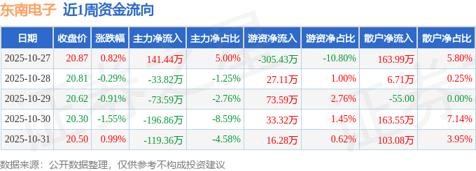 资金流向数据方面,本周东南电子主力资金合计净流出282.19万元,游资资金合计净流出155.13万元,散户资金合计净流入437.32万元。本周资金流向一览见下表: