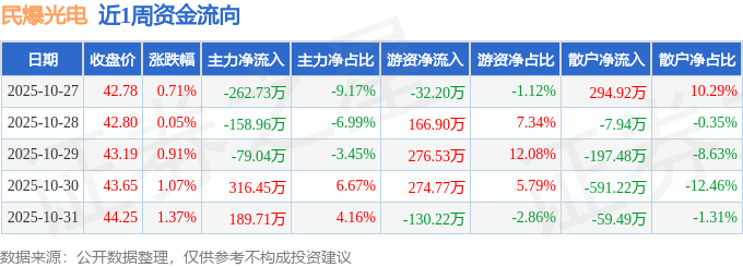 资金流向数据方面,本周民爆光电主力资金合计净流入5.42万元,游资资金合计净流入555.78万元,散户资金合计净流出561.2万元。本周资金流向一览见下表: