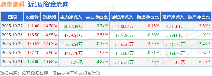 资金流向数据方面,本周鼎泰高科主力资金合计净流出8807.34万元,游资资金合计净流出197.46万元,散户资金合计净流入9004.79万元。本周资金流向一览见下表: