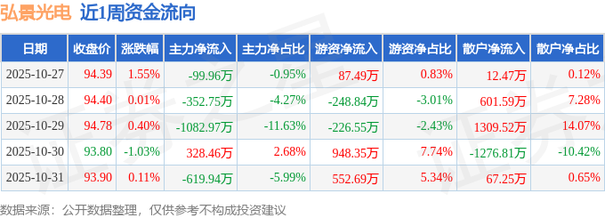 资金流向数据方面,本周弘景光电主力资金合计净流出1827.16万元,游资资金合计净流入1113.14万元,散户资金合计净流入714.03万元。本周资金流向一览见下表: