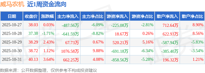 资金流向数据方面,本周威马农机主力资金合计净流入677.4万元,游资资金合计净流出1235.95万元,散户资金合计净流入558.54万元。本周资金流向一览见下表: