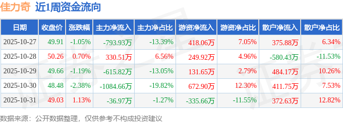资金流向数据方面,本周佳力奇主力资金合计净流出2200.87万元,游资资金合计净流入1136.87万元,散户资金合计净流入1064.0万元。本周资金流向一览见下表: