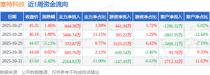 资金流向数据方面,本周富特科技主力资金合计净流入2664.91万元,游资资金合计净流入3115.39万元,散户资金合计净流出5780.3万元。本周资金流向一览见下表: