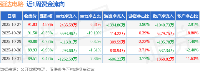 资金流向数据方面,本周强达电路主力资金合计净流出4828.38万元,游资资金合计净流出746.34万元,散户资金合计净流入5574.72万元。本周资金流向一览见下表: