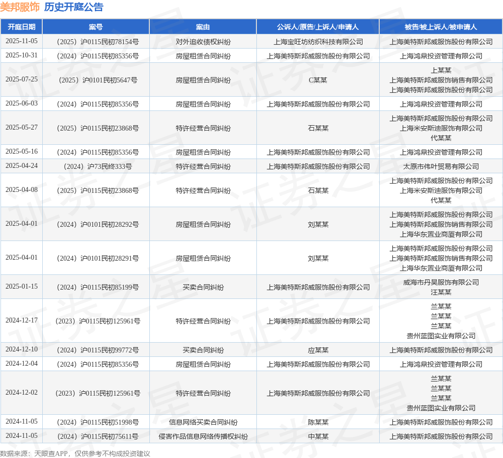 案号:(2025)沪0115民初78154号根据统计,近一年内以上海美特斯邦威服饰股份有限公司为当事人的历史开庭公告有17则,其中案由为“房屋租赁合同纠纷”的公告以7则居首,其次为“特许经营合同纠纷”有5则,“买卖合同纠纷”有2则。历史开庭公告如下: