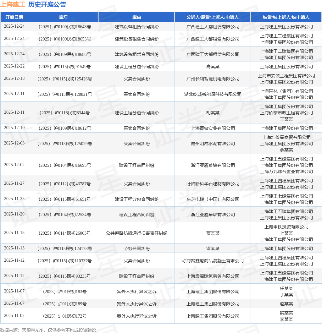案号:(2025)沪0115民初107626号根据统计,近一年内以上海建工集团股份有限公司为当事人的历史开庭公告有448则,其中案由为“买卖合同纠纷”的公告以116则居首,其次为“建设工程施工合同纠纷”有90则,“建设工程分包合同纠纷”有47则。历史开庭公告(前20条)如下: