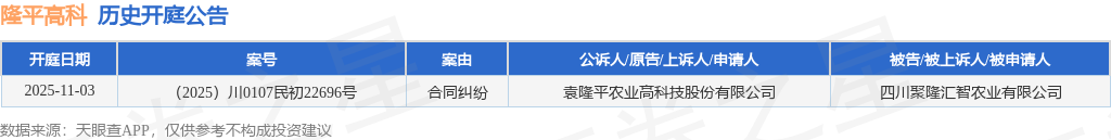 根据统计,近一年内以袁隆平农业高科技股份有限公司为当事人的历史开庭公告有1则,其中案由为“合同纠纷”的公告以1则居首。历史开庭公告如下:
