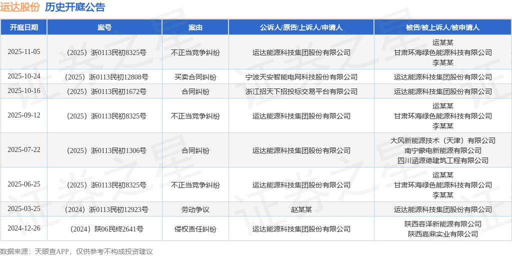 案号:(2025)浙0113民初8325号根据统计,近一年内以运达能源科技集团股份有限公司为当事人的历史开庭公告有8则,其中案由为“不正当竞争纠纷”的公告以3则居首,其次为“合同纠纷”有2则,“买卖合同纠纷”有1则。历史开庭公告如下: