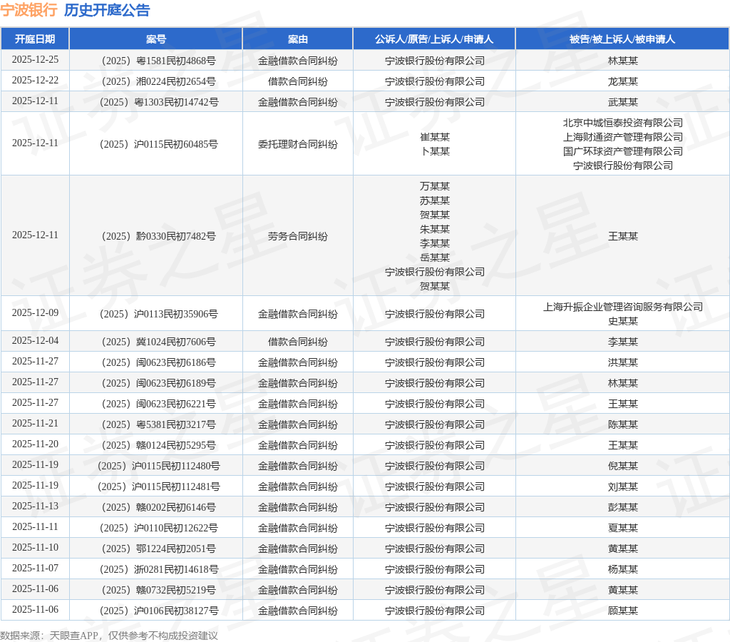 案号:(2025)新0106民初8071号根据统计,近一年内以宁波银行股份有限公司为当事人的历史开庭公告有1822则,其中案由为“金融借款合同纠纷”的公告以1614则居首,其次为“借款”有119则,“借款合同纠纷”有52则。历史开庭公告(前20条)如下: