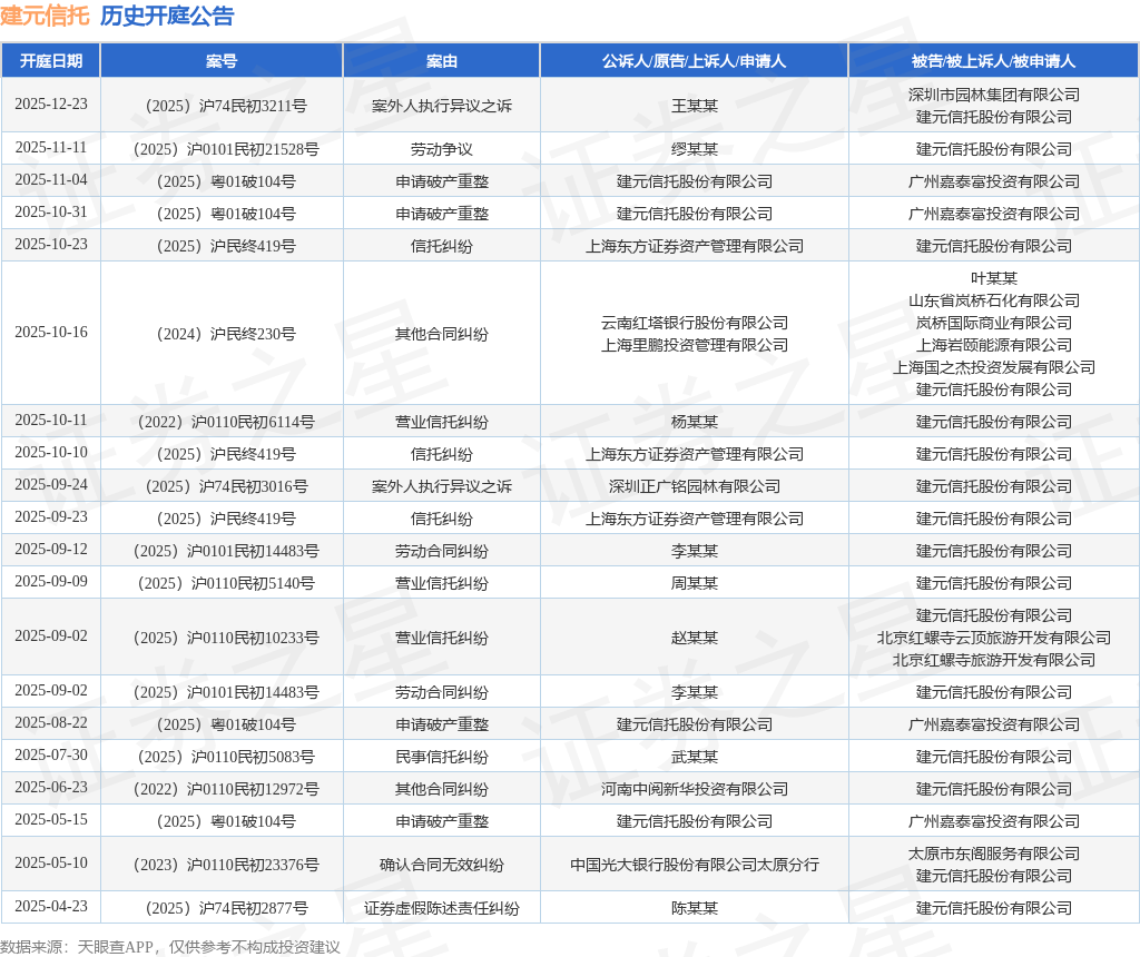 根据统计,近一年内以建元信托股份有限公司为当事人的历史开庭公告有23则,其中案由为“申请破产重整”的公告以4则居首,其次为“信托纠纷”有3则,“营业信托纠纷”有3则。历史开庭公告(前20条)如下: