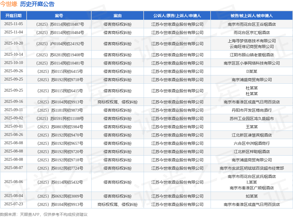 案号:(2025)苏0114民初10487号根据统计,近一年内以江苏今世缘酒业股份有限公司为当事人的历史开庭公告有75则,其中案由为“侵害商标权纠纷”的公告以66则居首,其次为“商标权权属、侵权纠纷”有3则,“建设工程分包合同纠纷”有3则。历史开庭公告(前20条)如下: