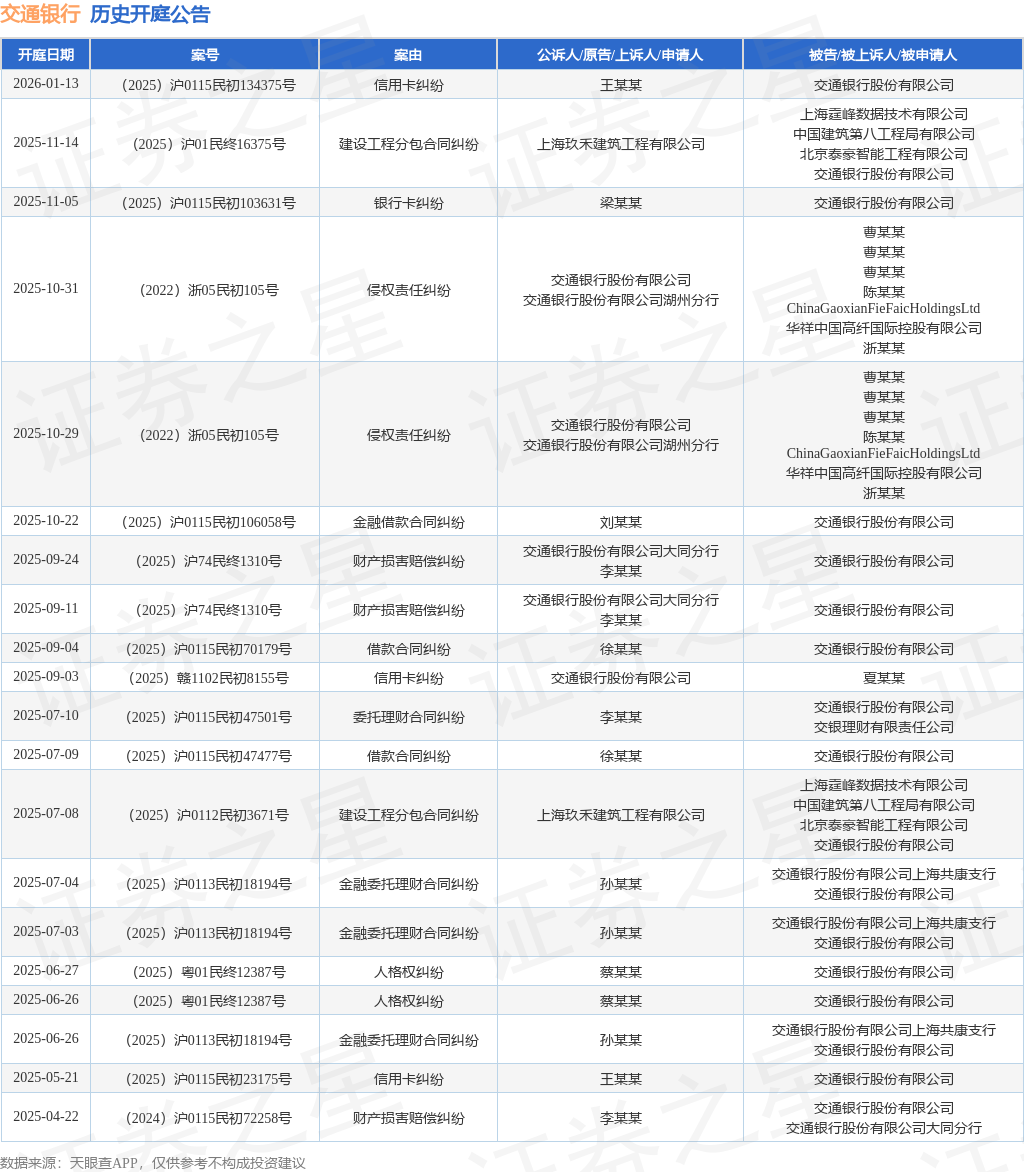 案号:(2025)沪0115民初103631号根据统计,近一年内以交通银行股份有限公司为当事人的历史开庭公告有28则,其中案由为“信用卡纠纷”的公告以7则居首,其次为“财产损害赔偿纠纷”有6则,“侵权责任纠纷”有3则。历史开庭公告(前20条)如下: