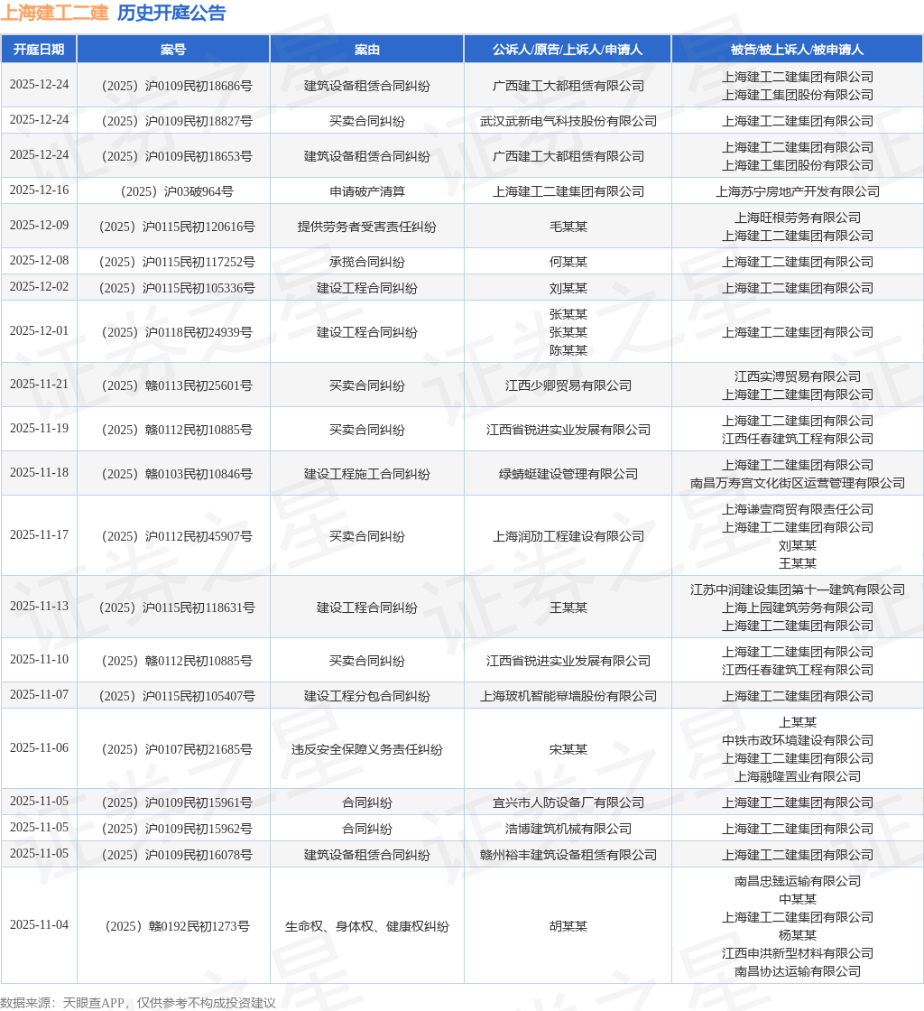 案号:(2025)沪0109民初16078号根据统计,近一年内以上海建工二建集团有限公司为当事人的历史开庭公告有271则,其中案由为“建设工程施工合同纠纷”的公告以70则居首,其次为“买卖合同纠纷”有30则,“建设工程分包合同纠纷”有29则。历史开庭公告(前20条)如下: