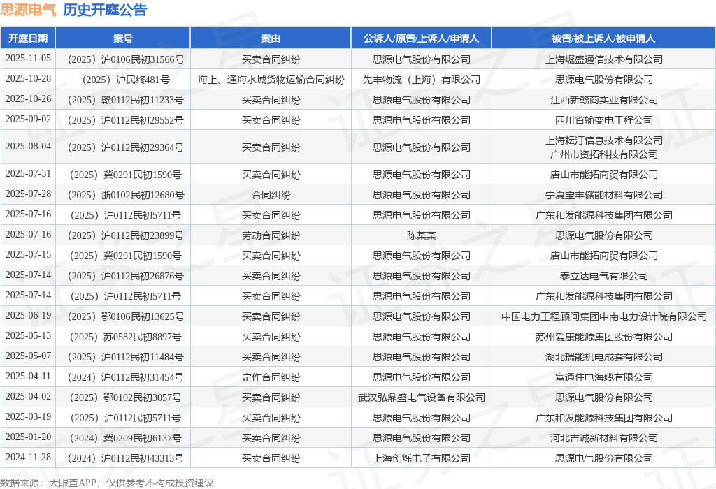 案号:(2025)沪0106民初31566号根据统计,近一年内以思源电气股份有限公司为当事人的历史开庭公告有21则,其中案由为“买卖合同纠纷”的公告以17则居首,其次为“劳动合同纠纷”有1则,“合同纠纷”有1则。历史开庭公告(前20条)如下: