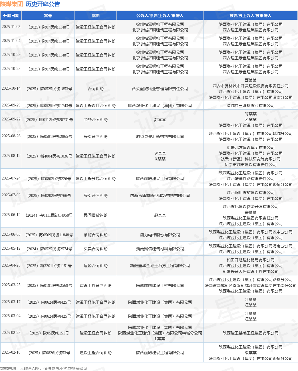 案号:(2025)陕07民终1148号根据统计,近一年内以陕西煤业化工建设(集团)有限公司为当事人的历史开庭公告有30则,其中案由为“建设工程合同纠纷”的公告以8则居首,其次为“建设工程施工合同纠纷”有8则,“买卖合同纠纷”有4则。历史开庭公告(前20条)如下: