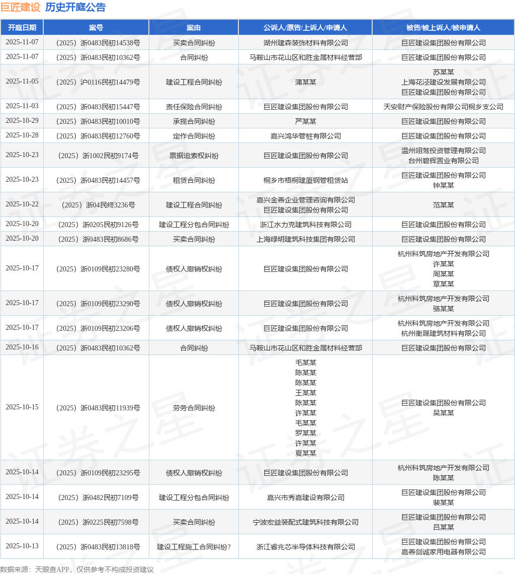 案号:(2025)沪0116民初14479号根据统计,近一年内以巨匠建设集团股份有限公司为当事人的历史开庭公告有229则,其中案由为“买卖合同纠纷”的公告以74则居首,其次为“合同纠纷”有35则,“建设工程施工合同纠纷”有30则。历史开庭公告(前20条)如下: