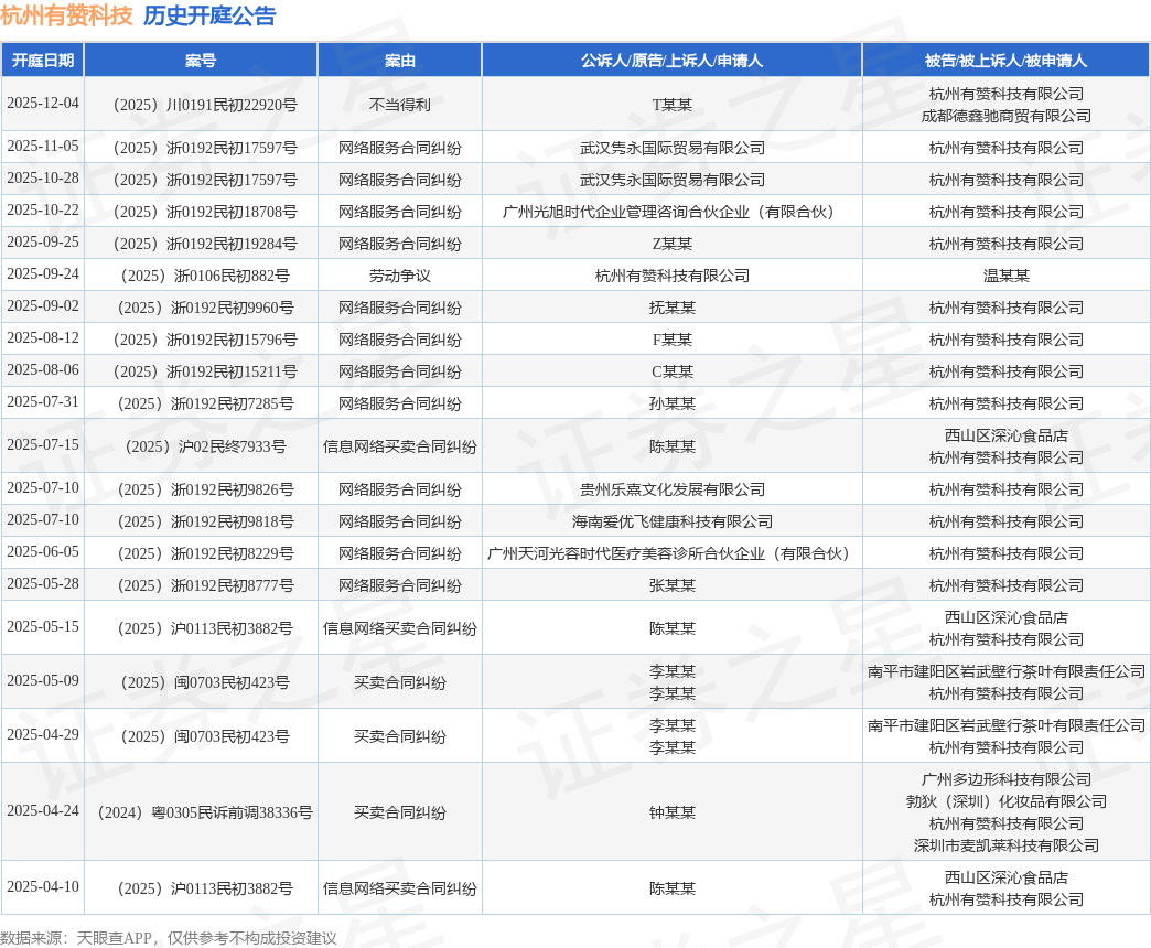 案号:(2025)浙0192民初17597号根据统计,近一年内以杭州有赞科技有限公司为当事人的历史开庭公告有33则,其中案由为“网络服务合同纠纷”的公告以23则居首,其次为“买卖合同纠纷”有3则,“信息网络买卖合同纠纷”有3则。历史开庭公告(前20条)如下: