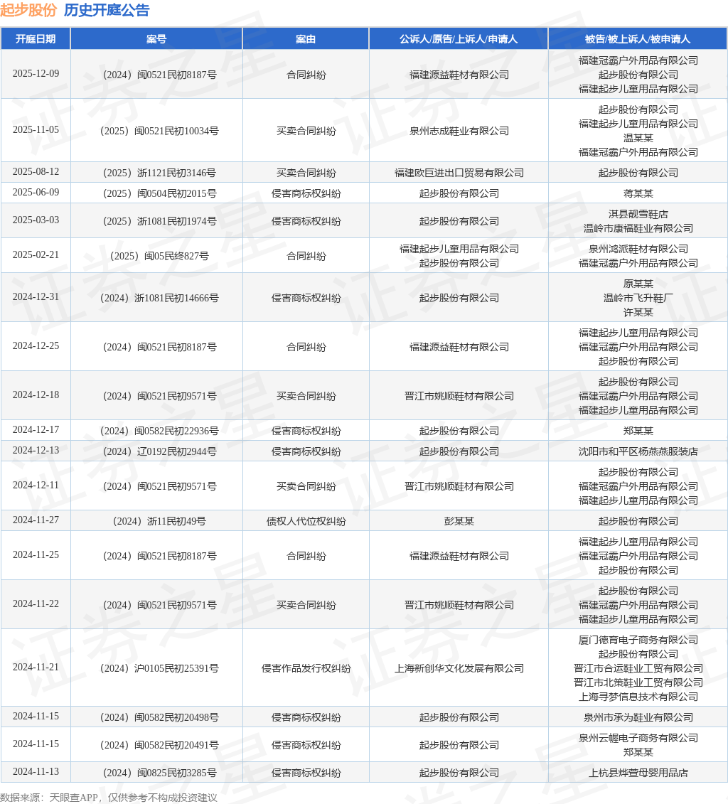 根据统计,近一年内以起步股份有限公司为当事人的历史开庭公告有19则,其中案由为“侵害商标权纠纷”的公告以8则居首,其次为“买卖合同纠纷”有5则,“合同纠纷”有4则。历史开庭公告如下: