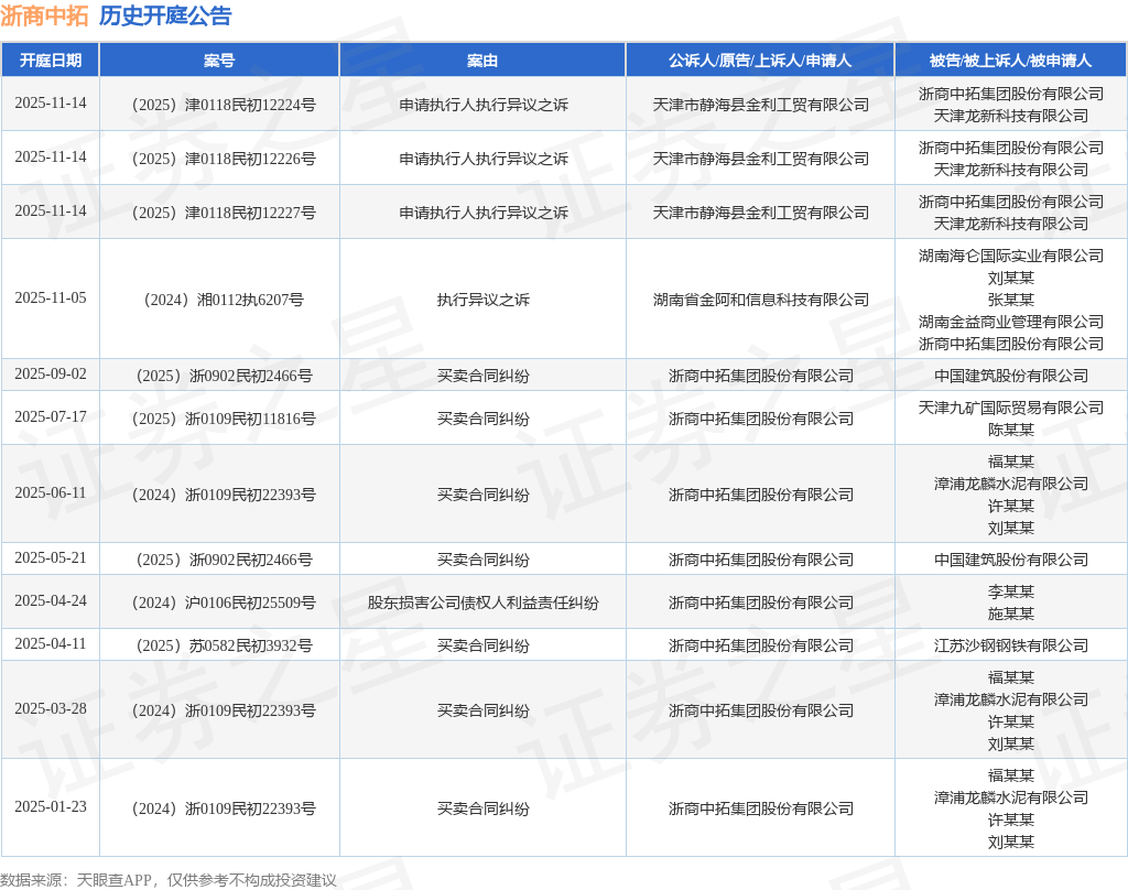 案号:(2024)湘0112执6207号根据统计,近一年内以浙商中拓集团股份有限公司为当事人的历史开庭公告有12则,其中案由为“买卖合同纠纷”的公告以7则居首,其次为“申请执行人执行异议之诉”有3则,“执行异议之诉”有1则。历史开庭公告如下: