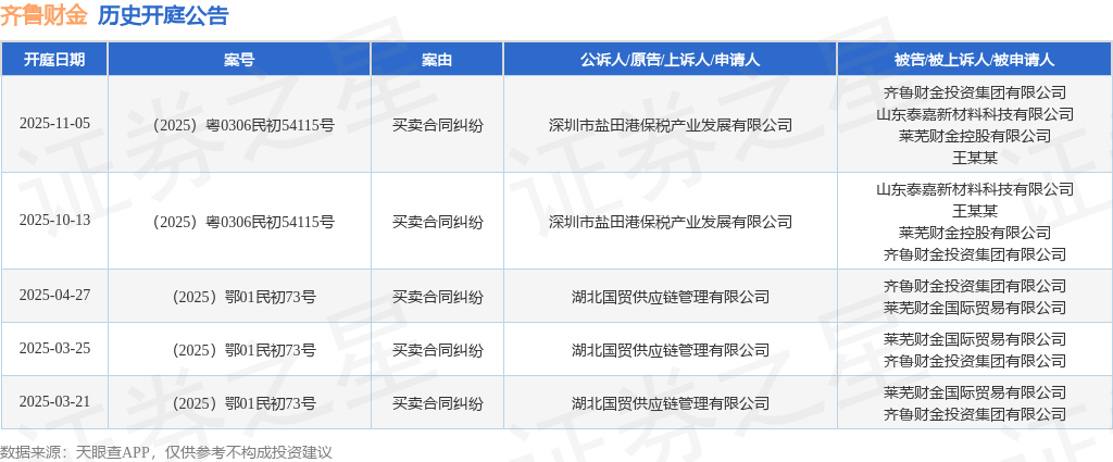 根据统计,近一年内以齐鲁财金投资集团有限公司为当事人的历史开庭公告有5则,其中案由为“买卖合同纠纷”的公告以5则居首。历史开庭公告如下: