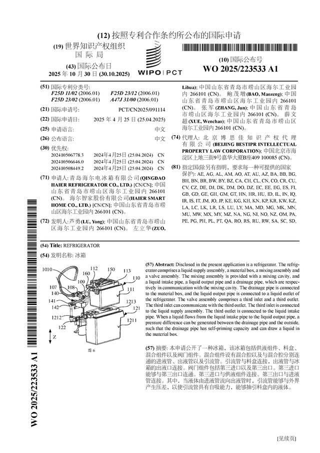 证券之星消息,根据企查查数据显示海尔智家(600690)公布了一项国际专利申请,专利名为“冰箱”,专利申请号为PCT/CN2025/091114,国际公布日为2025年10月30日。