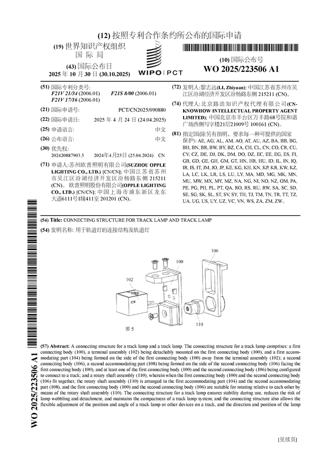 证券之星消息,根据企查查数据显示欧普照明(603515)公布了一项国际专利申请,专利名为“用于轨道灯的连接结构及轨道灯”,专利申请号为PCT/CN2025/090880,国际公布日为2025年10月30日。