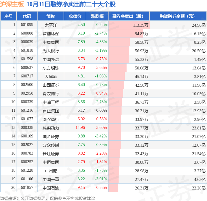 沪深主板融券净卖出前三分别为:太平洋(601099)融券净卖出113.39万股、首创环保(600008)融券净卖出94.87万股、中集集团(000039)融券净卖出58.58万股,前20具体见下表:
