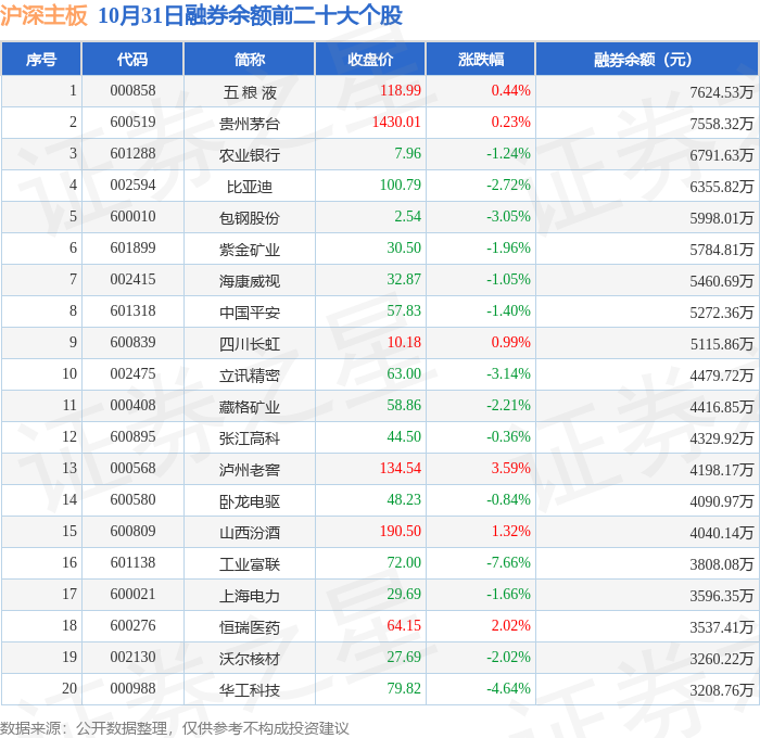 沪深主板融券余额前三分别为:五 粮 液(000858)融券余额7624.53万元、贵州茅台(600519)融券余额7558.32万元、农业银行(601288)融券余额6791.63万元,前20具体见下表:
