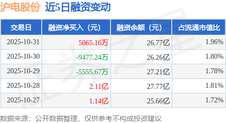证券之星消息,10月31日,沪电股份(002463)融资买入4.38亿元,融资偿还3.88亿元,融资净买入5065.16万元,融资余额26.77亿元。
