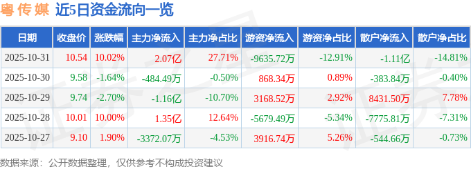 证券之星消息,截至2025年10月31日收盘,粤 传 媒(002181)报收于10.54元,上涨10.02%,涨停,换手率6.46%,成交量73.33万手,成交额7.47亿元。