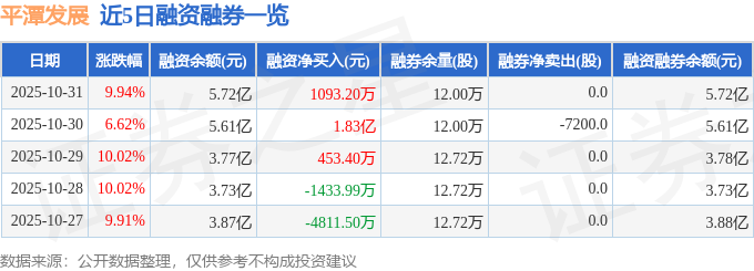 证券之星消息,截至2025年10月31日收盘,平潭发展(000592)报收于7.08元,上涨9.94%,涨停,换手率26.59%,成交量509.16万手,成交额34.88亿元。
