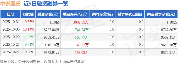 证券之星消息,截至2025年10月31日收盘,中锐股份(002374)报收于3.34元,上涨9.87%,已连续涨停2天,换手率17.72%,成交量192.35万手,成交额6.08亿元。