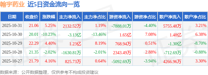 证券之星消息,截至2025年10月31日收盘,翰宇药业(300199)报收于21.06元,上涨5.25%,换手率11.52%,成交量85.9万手,成交额17.93亿元。