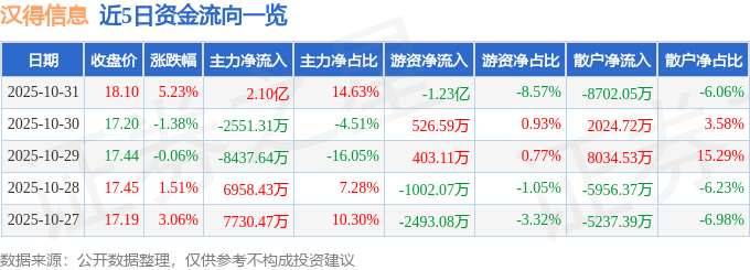 证券之星消息,截至2025年10月31日收盘,汉得信息(300170)报收于18.1元,上涨5.23%,换手率8.21%,成交量80.03万手,成交额14.35亿元。