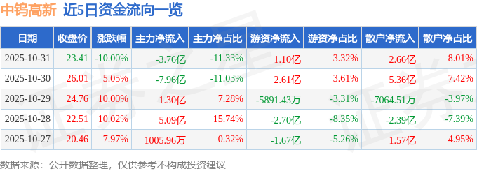 证券之星消息,截至2025年10月31日收盘,中钨高新(000657)报收于23.41元,下跌10.0%,跌停,换手率9.53%,成交量137.68万手,成交额33.24亿元。