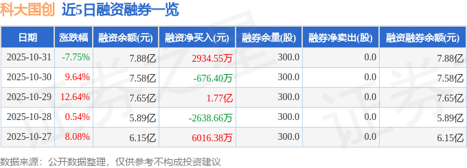 科大国创融资融券信息显示,融资方面,当日融资买入3.94亿元,融资偿还3.65亿元,融资净买入2934.55万元。融券方面,融券卖出0.0股,融券偿还0.0股,融券余量300.0股,融券余额1.27万元。融资融券余额7.88亿元。