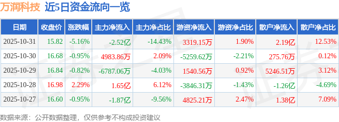 证券之星消息,截至2025年10月31日收盘,万润科技(002654)报收于15.82元,下跌5.16%,换手率12.87%,成交量108.75万手,成交额17.45亿元。