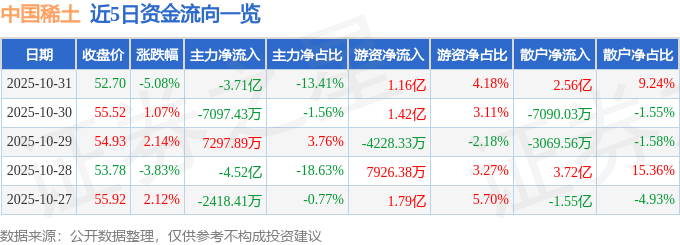 证券之星消息,截至2025年10月31日收盘,中国稀土(000831)报收于52.7元,下跌5.08%,换手率4.92%,成交量52.18万手,成交额27.66亿元。
