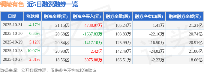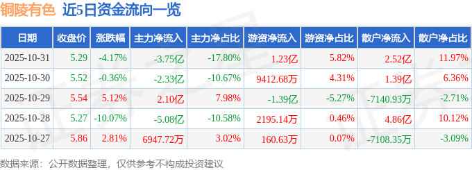 证券之星消息,截至2025年10月31日收盘,铜陵有色(000630)报收于5.29元,下跌4.17%,换手率3.53%,成交量393.12万手,成交额21.06亿元。