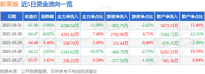 证券之星消息,截至2025年10月31日收盘,新莱福(301323)报收于61.98元,下跌3.86%,换手率8.86%,成交量5.93万手,成交额3.68亿元。