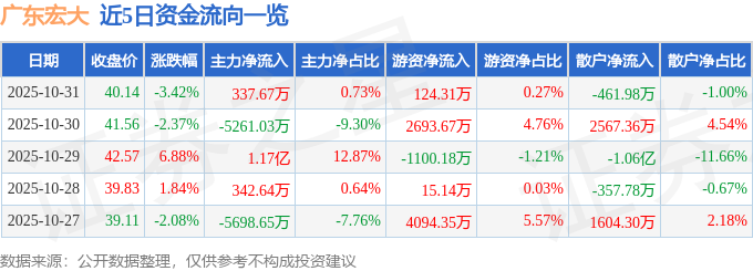 证券之星消息,截至2025年10月31日收盘,广东宏大(002683)报收于40.14元,下跌3.42%,换手率1.72%,成交量11.37万手,成交额4.61亿元。